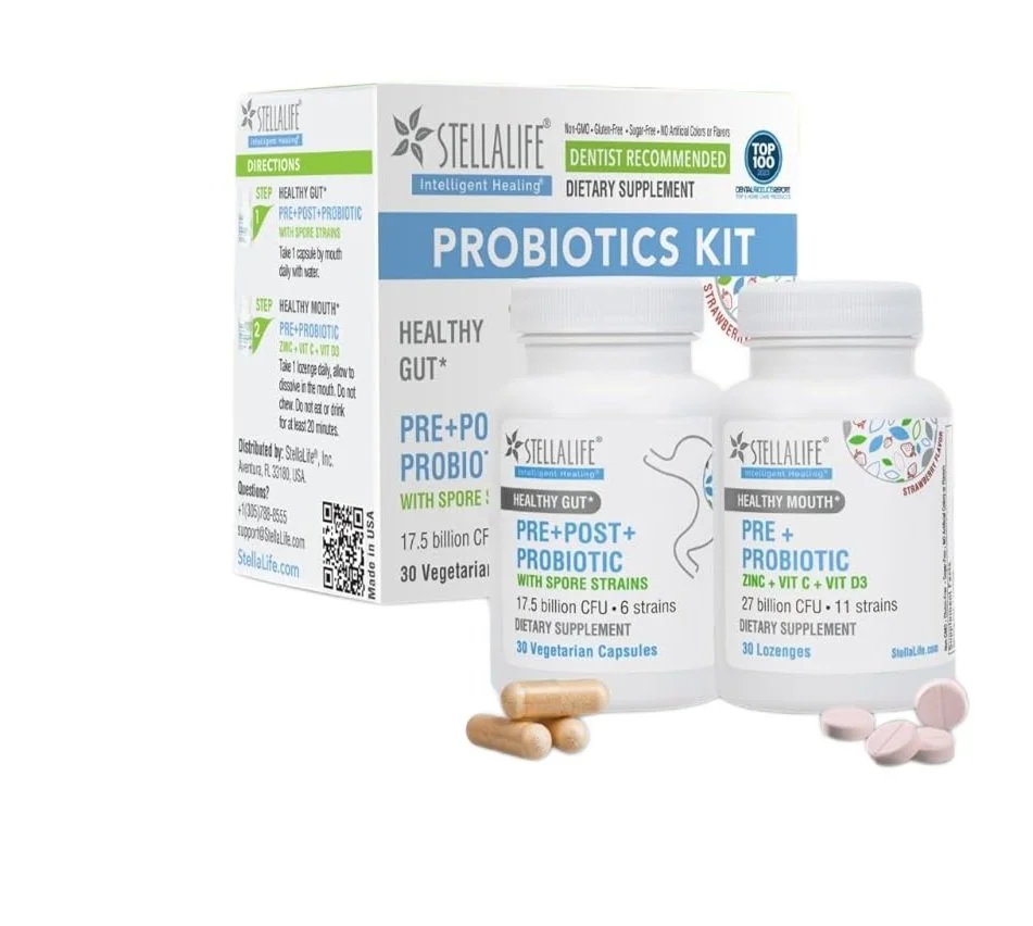 A comprehensive oral health formulation designed to harmonize the oral and gut microbiomes using 17 clinically studied probiotic strains. This professional-grade kit combines strawberry-flavored oral lozenges to crowd out odor-causing bacteria with spore-based capsules that survive stomach acid to support digestive and immune health. It is an ideal, toxin-free solution for anyone looking to achieve long-term fresh breath and optimal oral-systemic wellness.